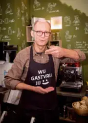 Vragen is niet nodig, ik zie zo ook wel dat ze genieten van hun soep. Tijdens het praten door, want Christophes opzet om mensen met elkaar contact te laten leggen, lukt. Elk gesprek begon met "Knap he, dat hij als dove een zaak runt”. Maar inmiddels zijn we, klanten onder elkaar, al een hecht clubje en weet ik dat de baby een meisje van zeven maanden oud is en dat ze thuis nog een zusje heeft. Het oudere koppel komt van de tentoonstelling ‘Oer’ die volgens hen een aanrader is. En als de moeder even haar beide handen nodig heeft, krijgt de tolk de baby op schoot. Toch gek, bedenk ik, dat een dove man ons moet leren om met elkaar te praten…